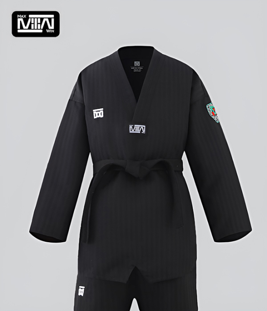 El dobok negro completo de MAXWIN combina elegancia y sobriedad, siendo un uniforme premium ideal para practicantes, instructores, equipos de exhibición y maestros.