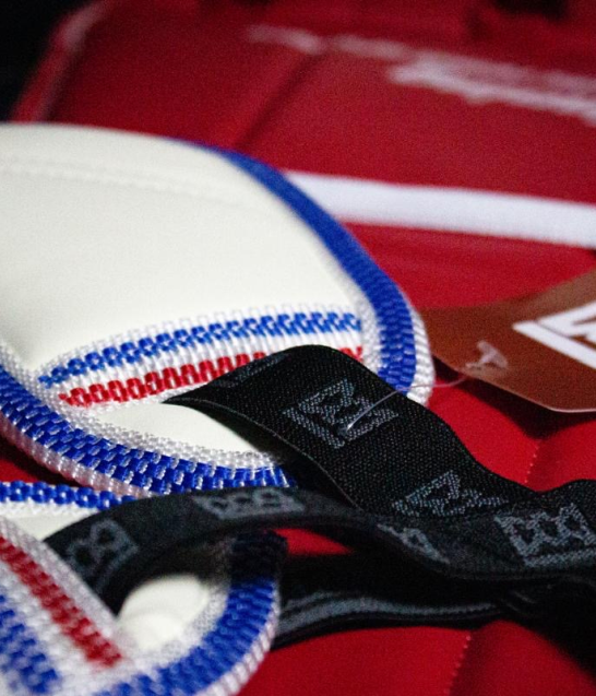 Su diseño reversible (rojo/azul) permite un uso práctico durante entrenamientos y competencias oficiales.